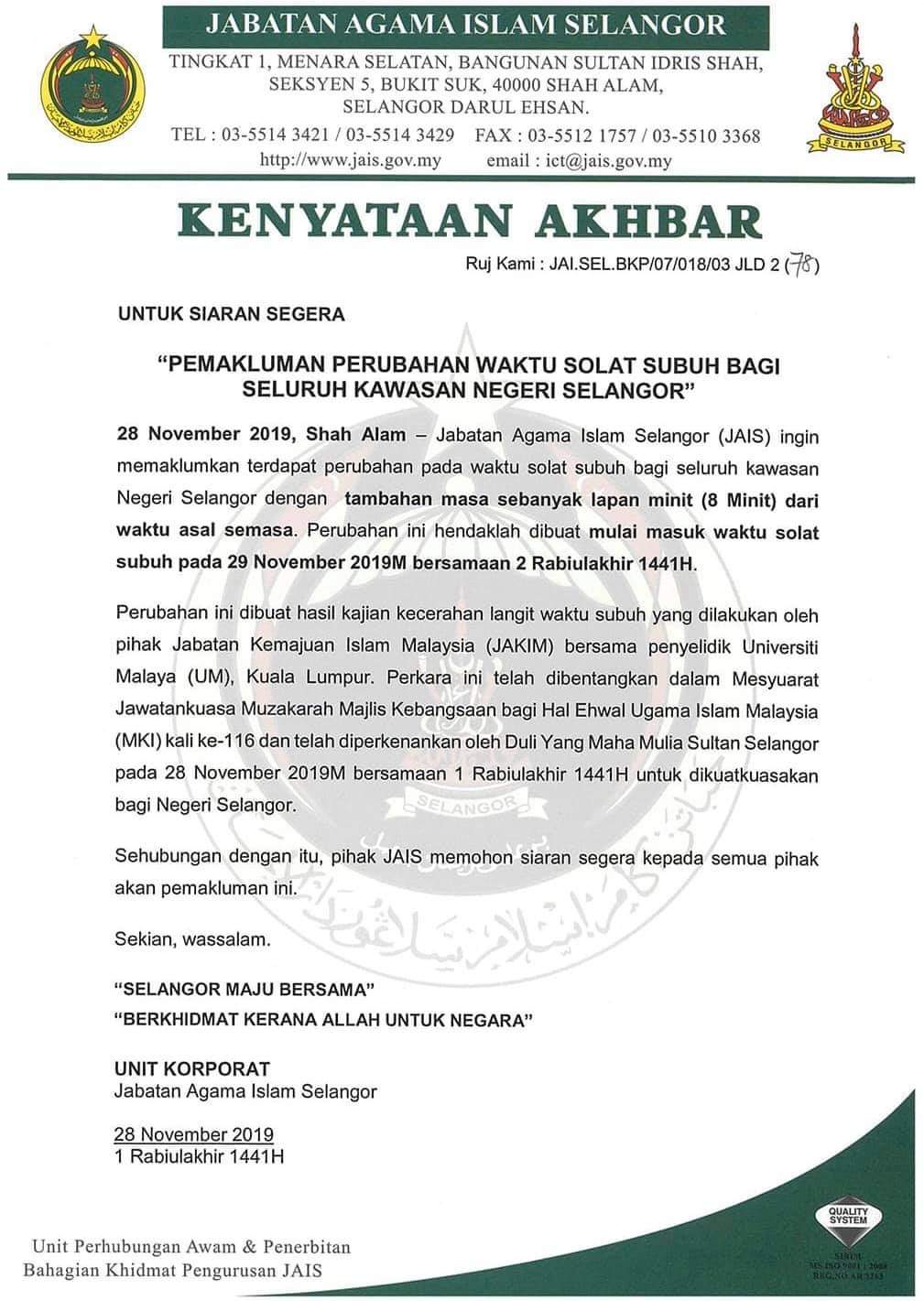 Asal Gombak On Twitter Perubahan Waktu Solat Subuh Mulai Esok Iaitu 29hb November 2019 Waktu Solat Subuh Dilewatkan 8 Minit Daripada Jadual Asal Bagi Seluruh Selangor Ianya Dibuat Selepas Melihat Hasil Kajian